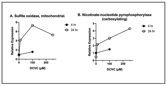 Two mitochondrial proteins identified in culture media of human proximal tubular (hPT) cells exposure to S-(1,2-dichlorovinyl)-L-cysteine (DCVC) (10, 100, or 250 µM) for 4 or 24 h. Primary cultures of hPT cells were incubated with either a culture medium (=control) or DCVC, and samples from the extracellular fluid were analyzed using TMTTM multiplexing and LC–MS/MS analysis, as described in the legend of Table 3. Results are shown as expression levels relative to that in the 4-h control samples and are from a single set of analyses.