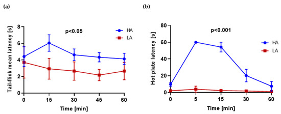 (a) Tail-flick latency in HA and LA mice (n = 5) in time after swimming, average of three repetitions; (b) hot plate test in HA and LA mice, in time after swimming (n = 5).