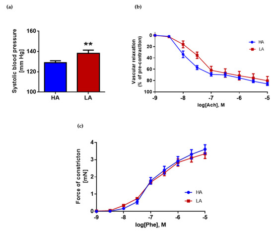 (a) Systolic blood pressure in HA and LA mice in basal conditions HA and LA (n = 25–27); (b) vascular relaxation of aortas from HA and LA mice in response to acetylcholine (n = 9–10); (c) Phenylephrine-induced vascular constriction in aortas from HA and LA mice (n = 9–10). ** p < 0.01.