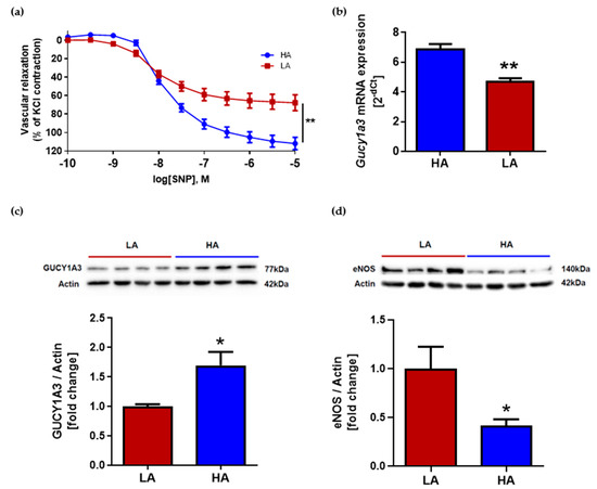 Vascular response to nitric oxide (NO)-donor after NOS (nitric oxide synthase) inhibition by (ω)-nitro-L-arginine methyl ester (L-NAME) was evaluated. Analysis of endothelium-independent relaxation showed differences between groups. The aorta from HA mice had significantly better relaxation in response to sodium nitroprusside (SNP) when compared to LA (Figure 3a). One of the key components involved in endothelium-independent vascular relaxation is guanylyl cyclase. The reduced expression of guanylate cyclase leads to the reduced production of cGMP, and thus impairs endothelial-independent diastolic capacity in the arteries. In our study, the expression of mRNA for Gucy1a3 in aortas was higher in HA mice (HA: 6.86 ± 0.37 vs. LA: 4.67 ± 0.25) (Figure 3b) and corresponded with the lower systolic BP of HA mice when compared to LA. Guanylyl cyclase expression on the protein level was also elevated in HA mice when compared to LA (1.70 ± 0.23 vs. 1.00 ± 0.04) (Figure 3c). Main source of NO for vascular smooth muscle cells is endothelial synthase. Interestingly, endothelium NOS expression on the protein level was decreased in aortas from HA mice in comparison to LA mice (0.41 ± 0.06 vs. 1.00 ± 0.22) (Figure 3d).