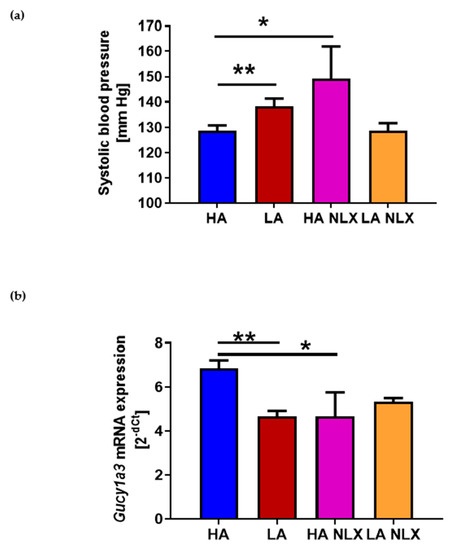 To testify the hypothesis that an observed effect on BP is related to opioid receptors, we performed an experiment where HA and LA mice were treated with non-specific opioid receptor antagonist—naloxone (NLX). The pharmacological blockade of opioid receptors led to the increase in systolic BP in HA mice (HA 128.77 ± 2.06 mmHg vs. HA NLX 149.26 ± 12.62 mmHg) (Figure 4a). Interestingly, we did not observed differences in BP level in naloxone-treated LA mice (LA 138.23 ± 3.05 mmHg vs. LA NLX 128.81 ± 2.88 mmHg) (Figure 4a). Hence, we performed an analysis of guanylyl cyclase of mRNA in those mice, being aware that the expression of that gene was decreased in LA mice. Naloxone treatment in HA mice significantly decreased guanylyl cyclase expression in the aorta (HA: 6.86 ± 0.37 vs. HA NLX: 4.67 ± 1.10) (Figure 4b). Interestingly, NLX treatment had no effect on guanylyl cyclase expression in LA mice (LA: 4.67 ± 0.25 vs. LA NLX: 5.35 ± 0.16) (Figure 4b).