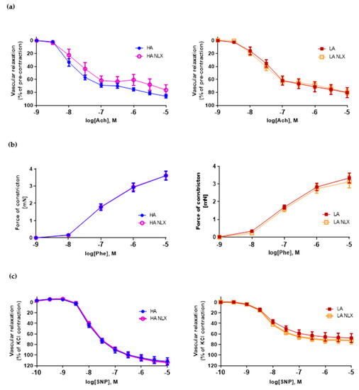 (a) Vascular relaxation of aortas from HA and LA mice and aortas treated in vitro with naloxone in response to acetylcholine (n = 4–10); (b) vascular constriction in aortas from HA and LA mice and aortas treated in vitro treated with naloxone in response to increasing doses of phenylephrine (n = 4–10); (c) endothelium-independent relaxation of aortas from HA and LA mice and aortas treated in vitro with naloxone in response to increasing doses of SNP (n = 4–10).