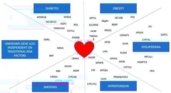 Cardiovascular disease (CVD) remains the most common cause of death in the majority of countries worldwide []. It includes coronary heart disease, cerebrovascular disease, peripheral arterial disease, rheumatic and congenital heart diseases, and venous thromboembolism (www.who.int/cardiovascular-disease#tab=tab_1/ accessed on 5 March 2021). Death rates from coronary heart disease (CHD) and stroke have generally been higher in Central and Eastern Europe (CEE) []. A decline in CVD mortality has been reported in most European countries; however, the decline in CVD mortality in CEE countries started substantially later []. Molecular genetics and pharmacogenetics play a key role in the diagnosis, prevention, and treatment of CVD. Genetic testing is used to identify the underlying genetic etiology in patients with suspected cardiovascular disease such as hypertrophic cardiomyopathy or familial hypercholesterolemia, and to determine who in the family has inherited the causal variant and is therefore at risk of developing CVD. Genetic testing should be carried out in well-phenotyped individuals and coupled with comprehensive family evaluation to aid in interpretation and application of the results []. Molecular genetics technologies applied to cardiovascular studies have enabled chromosome mapping and the identification of many genes involved in primary etiology (Figure 1).