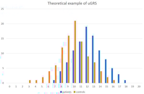 Theoretical example of gene score construction. Theoretical example of unweighted gene score (based on sum of the risky alleles) in group of patients and controls. With 10 genes (polymorphisms) the values could be between 0 and 20. In fact, the lowest and the highest values are almost never presented. There is significant shift in the distribution curve in patient groups to the higher numbers of risky alleles. Still, there is also significant overlap between the patients and controls in gene score values.