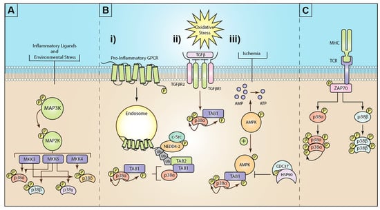 Mechanisms of mitogen-activated protein kinase (MAPK) p38 activation: (A) Inflammatory ligands and environmental stress trigger the activation of a three-tiered kinase cascade. Environmental or inflammatory ligands induce the activation of MAP3Ks through a complex array of different mechanisms. MAP3Ks then activate the critical MAP2Ks, MKK3, MKK6, or (less commonly) MKK4. These MAP2Ks can then differentially activate the four isoforms of p38 (α, β, γ, and δ). (B) The known mechanisms for atypical p38 signaling are (i) GPCR stimulation triggers G-protein dependent c-Src phospho-activation of the E3 ubiquitin ligase neural precursor cell expressed developmentally downregulated 4-2 (NEDD4-2). GPCRs recruit and are ubiquitinated by NEDD4-2. K63 ubiquitin chains recruit the ubiquitin-binding adaptor protein TAK1-binding protein 2 (TAB2). In turn, TAB2 then recruits TAB1, which binds and induces autophosphorylation of p38α. (ii) Oxidative stress triggers TGFβ activation, which drives TAB1 and p38 activation, although the exact mechanism is unclear. (iii) Ischemia or hypoxia events drive activation of AMP-activated protein kinase (AMPK), which in turn promotes the formation of the TAB1-p38α complex and p38α autophosphorylation. This process is negatively regulated by the heat shock protein 90 (HSP90)-Cdc37 complex. (C) T-cell receptor (TCR) ligation to major histocompatibility complex (MHC) drives intracellular activation of the src-family zeta-chain-associated protein kinase 70 (Zap70). Zap70 phosphorylates p38 at tyrosine 323, enabling autophosphorylation of p38α, or β.