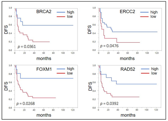 After cutoff determination using the partition test, the expression of none of the nine selected genes showed a significant association with overall survival (OS). Yet, for disease-free survival (DFS) a significant association could be seen for a lowered expression of BRCA2 (p = 0.0361, median DFS 7 months (mo) vs. not reached (n.r.)), ERCC2 (p = 0.0476, 8 vs. 27 mo), FOXM1 (p = 0.0268, 10 mo vs. n.r.), and RAD52 (p = 0.0392, 8 mo vs. n.r.) (Figure 1).