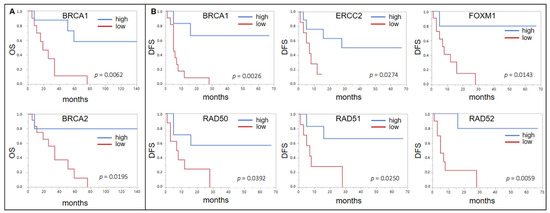 Using the same cutoff determination method for the subcohort of 20 patients who received ACBC, a low expression of BRCA1 (p = 0.0062, median OS 19 mo vs. n.r.) and BRCA2 (p = 0.0195, 36 mo vs. n.r.) was associated with a shorter OS (Figure 2A). For BRCA1 (p = 0.0026, median DFS 5 mo vs. n.r.), ERCC2 (p = 0.0274, 7 mo vs. n.r.), FOXM1 (p = 0.0143, 8 mo vs. n.r.), RAD50 (p = 0.0392, 7.5 mo vs. n.r.), RAD51 (p = 0.0250, 7 mo vs. n.r.), and RAD52 (p = 0.0059, 5 mo vs. n.r.), this was also seen for DFS (Figure 2B). BRCA2 almost reached significance (p = 0.0644, 7 mo vs. n.r.).