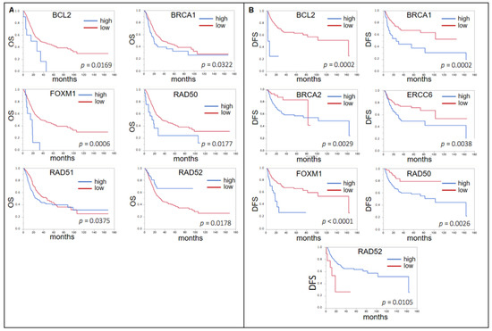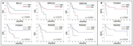 In those patients who received ACBC (n = 76) a high expression of ERCC2 indicated a shorter OS (p = 0.0170, median OS n.r. vs. 24.0 mo). Similar to our own cohort, a low expression of BCL2 (p = 0.0029, 18.1 vs. n.r.), ERCC6 (p = 0.0394, 28.6 vs. n.r.), FOXM1 (p = 0.0213, 28.8 vs. n.r.), RAD50 (p = 0.0227, 28.6 vs. n.r.), and RAD52 (p = 0.0226, 23.7 vs. n.r.) was indicative of a shorter OS (Figure 4A). A high expression of FOXM1 (p = 0.0005, median DFS 163.6 vs. 12.6 mo) and a low expression of RAD52 (p = 0.0129, 13.0 vs. 163.6 mo) indicated a shorter DFS (Figure 4B).