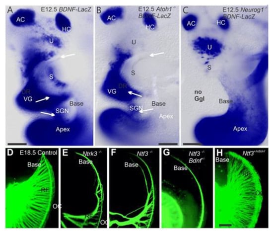 - Maricich, S.M.; Xia, A.; Mathes, E.L.; Wang, V.Y.; Oghalai, J.S.; Fritzsch, B.; Zoghbi, H.Y. Atoh1-lineal neurons are required for hearing and for the survival of neurons in the spiral ganglion and brainstem accessory auditory nuclei. J. Neurosci. 2009, 29, 11123–11133. [Google Scholar] [CrossRef] [PubMed][Green Version]