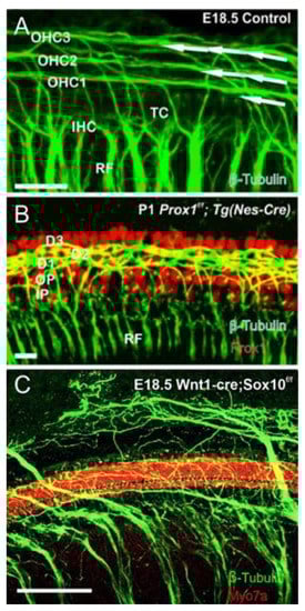 - Fritzsch, B.; Dillard, M.; Lavado, A.; Harvey, N.L.; Jahan, I. Canal cristae growth and fiber extension to the outer hair cells of the mouse ear require Prox1 activity. PLoS ONE 2010, 5, e9377. [Google Scholar] [CrossRef] [PubMed]