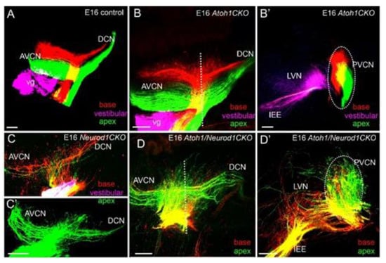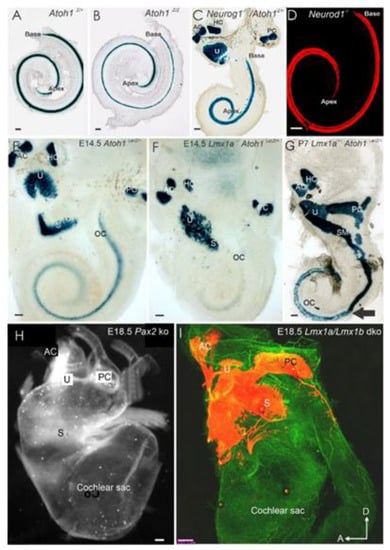 - Matei, V.; Pauley, S.; Kaing, S.; Rowitch, D.; Beisel, K.; Morris, K.; Feng, F.; Jones, K.; Lee, J.; Fritzsch, B. Smaller inner ear sensory epithelia in Neurog1 null mice are related to earlier hair cell cycle exit. Dev. Dyn. 2005, 234, 633–650. [Google Scholar] [CrossRef]