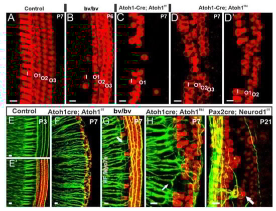 - Chen, P.; Johnson, J.E.; Zoghbi, H.Y.; Segil, N. The role of Math1 in inner ear development: Uncoupling the establishment of the sensory primordium from hair cell fate determination. Development 2002, 129, 2495–2505. [Google Scholar]