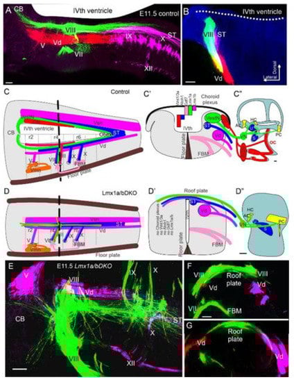 - Iskusnykh, I.Y.; Steshina, E.Y.; Chizhikov, V.V. Loss of Ptf1a leads to a widespread cell-fate misspecification in the brainstem, affecting the development of somatosensory and viscerosensory nuclei. J. Neurosci. 2016, 36, 2691–2710. [Google Scholar] [CrossRef] [PubMed][Green Version]