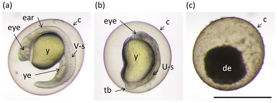 Examples of different phenotypes of zebrafish embryos at 24 h post fertilization (hpf) found in the bioassay described in the Section 2.6 “Toxicity”. (a) Normally developed embryo; (b) embryo with underdeveloped eye, brain and impaired extensions of yolk sack and tail; and (c) dead embryo. Ear; eye; y: yolk; ye: yolk extension; V-s: v-shaped somite; U-s: abnormally-shaped somite; tb: tail bud; and de: decomposing embryo. Scale bar equals 1 mm.