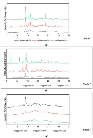 The opposite situation is observed for γ-CD complexes. The flat PXRD patterns for both Caf@γ-CD2 and Caf@γ-CD3 indicate their amorphous character. On the other hand, Caf@γ-CD1 is crystalline, and its PXRD pattern is similar to that of its counterpart mixture (Caf+γ-CD1). Therefore, the presence of water seems to be an essential condition for the complexation of caffeine with γ-CD. Moreover, the PXRD pattern of Caf+γ-CD1 contains signals from hydrated γ-CD3 instead of dry γ-CD1 (Supplementary Figure S3). Therefore, it is plausible that this sample contained moisture adsorbed from the air. This observation could additionally lead to the conclusion that the presence of water is thermodynamically favored in the case of γ-CD complexes. The supporting role of water as a space-filling molecule in inclusion complexes of CDs has been reported in many crystal structures (derived from single-crystal X-ray diffraction refinements) of such systems [27,28,29].