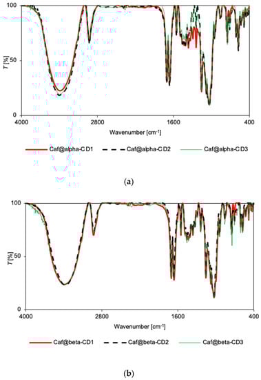 However, when the IR spectra for all the putative complexes for the β-CD series are compared (Figure 3b), they show the same pattern with the exception of slightly higher intensities of the 611, 746, and 857 cm−1 bands in the case of Caf@β-CD3. As these bands were ascribed to the vibrations of the imidazole ring [32] it is possible that the presence of water is unfavorable for the introduction of this part of the caffeine molecule into the β-CD cavity. On the other hand, in the Raman spectra there are no differences between the relative intensities of the spectra for all the putative complexes (Figure 4b), or between the spectra of the putative complexes (Caf@β-CD1 and Caf@β-CD3) and the corresponding mixtures (Caf+β-CD1 and Caf+β-CD3) (Supplementary Figures S27 and S28). Nevertheless, in the presence of water (Caf@β-CD3), a slight broadening of the caffeine bands in the range of 1500–1800 cm−1 (the ν(C=O) and ν(C=C) + δ(HCN) modes) (Figure 4b and Supplementary Figure S28) can be seen in the Raman spectra, which may indicate weak interactions of these groups with the host molecule.