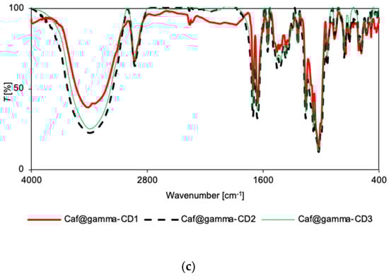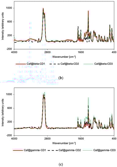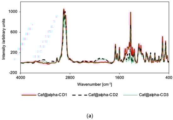 For the γ-CD series, no differences in the spectral patterns were observed for Caf@γ-CD1 and Caf+γ-CD1, nor for Caf@γ-CD3 and Caf+γ-CD3 in either the IR or Raman spectra (Supplementary Figures S23, S24, S29 and S30). Thus, the differences observed in the IR and Raman spectra of the putative complexes prepared by various methods (Figure 3c and Figure 4c), namely, the broadening of bands in the range of 1200–1530 cm−1 for Caf@γ-CD3, are probably due to the presence or absence of water in the system and not to the formation of new bonds between the guest and host molecules.