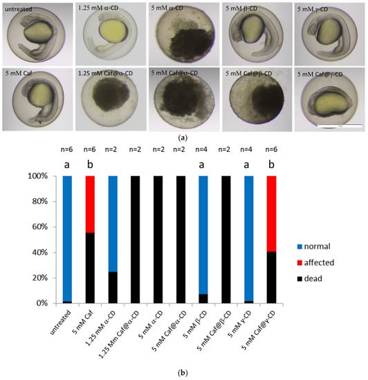 The effect of Caf@CDs on early development of the zebrafish embryo. (a) Images of zebrafish embryos after exposure to caffeine (Caf), CDs or Caf@CDs from 4 till 24 hpf. Embryos exposed to Caf@γ-CD show underdeveloped eyes, ears and severely impaired convergent extension. Less severe morphological abnormalities were also present in embryos exposed to 5 mM Caf. Exposure to 5 mM α-CD, 1.25 mM Caf@α-CD, or 5 mM Caf@β-CD was lethal to the embryos. Examples of live embryos at a most advanced developmental stage are shown. Scale bar, 1 mm. (b) Changes in the proportion between the dead, morphologically abnormal (affected), and unaffected (normal) embryos. The percentage of embryos which died upon treatment with Caf or Caf@CDs was significantly higher than that of untreated control. Also, pure α-CD was more toxic than the other two CDs, whereas β-CD and γ-CD had no effect on both the fish survival and their morphology. In order to reduce the number of animals, in the case of treatments which caused 100% rapid mortality, the experiments were repeated twice. Bars present mean values, n is the number of repetitions, each on 24 embryos. Mann-Whitney U test was performed on samples with ≥3 biological replicas. Statistically significant differences (p < 0.01) were marked with different letters.