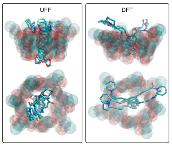 The piperine ligand molecule was prepared by using the Avogadro 1.1.1 software [26] and optimized within the Universal force field (UFF) [27] (5000 steps, steepest descent algorithm). The structure of HP-β-CD was prepared based on the available crystal structure of unfunctionalized β-CDs, the results of our earlier (unpublished) studies as well as the structural parameters available in the literature [28]. According to the experimental data, the molar weight of HP-β-CD corresponds to a unique substitution pattern, according to which only a single glucose residue lacks unfunctionalization. The hydroxymethyl groups attached to HP-β-CD were initially oriented in the trans conformation, in agreement with the dominated conformer found in glucose monosaccharide. The 2-HP moieties were oriented in order to facilitate the hydrogen bonding-mediated contacts between neighboring units. The resulting structure was optimized within the UFF force field (10,000 steps) and either directly subjected to docking or further optimized at the high-level theory (DFT/B3LYP/6-311G (d,p) [29]. The flexible, optimized ligand molecule was docked into those two structures of HP-β-CD (denoted, following the optimization level, as UFF and DFT). The AutoDock Vina 4.0 software [30] was applied for docking simulations. The docking procedure was carried out within the cuboid region large enough to accommodate the whole HP-β-CD molecule. All the default procedures and algorithms implemented in AutoDock Vina were applied during the docking procedure. The complexes were analyzed in terms of binding energies and binding-related interactions.