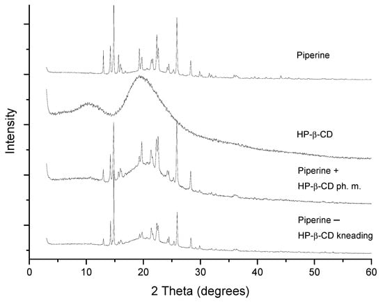 The piperine mixture ––HP-β-CD in the mass ratio 1:1—was prepared according to the kneading technique. Both substances were ground in the mortar. Next, both substances, with a minor amount of alcohol and distilled water used to receive a pasty consistency, were ground for 60 min in mortar. Later, it was drying at 45 °C for 24 h, and then the mixture was ground again for 10 min. The physical mixture in the same ratio of the compounds was also prepared.