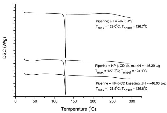 The combinations of piperine and CD were characterized by the techniques: XRPD, DSC, NMR, and FT-IR. XRPD patterns are shown in Figure 3. HP-β-CD diffractogram is typical for an amorphous material. Piperine produces a crystalline pattern consisting of a series of well-defined sharp peaks. Superimposed diffraction patterns were obtained for HP-β-CD + piperine physical mixture and two-component sample prepared by kneading. Diffractometric and thermal analysis (Figure 4) allowed to exclude a strong piperine and HP-β-CD complex formation. However, the formation of a weak complex between piperine and HP-β-CD can be suggested. The kneading technique did not require any energy input, only a minimum amount of solvents. Thus, based on XRPD and DSC methods, the possibility of only intermolecular piperine–CD interaction via piperine adhesion on the CD surface or a weak inclusion of piperine into HP-β-CD can be suggested.