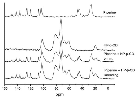 As shown in Figure 6, the solid-state 13C NMR spectra recorded for the physical mixture and the kneading mixture are virtually indistinguishable, and they both represent a simple superposition of spectra acquired for individual components, i.e., CD and piperine. It is worth emphasizing that all NMR signal parameters, namely their positions and linewidths, are preserved after mixing. This result suggests that if there is any interaction taking place between two components, it must be subtle since it does not alter the chemical environment of detected carbons substantially, i.e., chemical shielding is preserved.