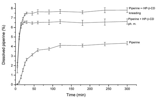 The occurrence of interactions between poorly soluble molecules and hydrophilic macromolecules may result in an increase in their solubility. The dissolution study for combinations of piperine and cyclodextrins (Figure 7) was conducted for 5 h, the plateau is achieved for pure piperine after 120 min, while piperine in kneading the mixture with CD reaches the plateau in about 30 min, which proves the increase in the dissolution rate of piperine in the kneading mixture. The maximum value for piperine in the kneading mixture was 7.82 ± 0.24%, while for dissolved piperine, it was 4.35 ± 0.17% (solubility of piperine in the physical mixture was 6.62 ± 0.28%). The solubility of the piperine in the kneading mixture was almost doubled comparing to pure piperine, which is statistically significant according to fit factor f1. The percentage of dissolved piperine in every time point was as follows: kneading mixture > physical mixture > pure piperine.