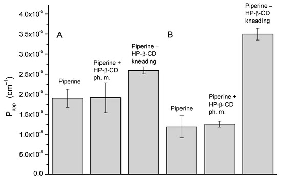The consequence of the enhanced solubility of piperine was its greater permeability through the system of artificial biological membranes. The study of permeability through the mixture of artificial biological membranes was carried out in the GIT (pH ≈ 6.8) and BBB (pH ≈ 7.4) conditions; the results are shown in Figure 8. In the study for the GIT, the Papp value for piperine is 1.90 × 10−5 ± 2.25 × 10−6 cm/s, for the physical mixture, it is 1.91 × 10−5 ± 3.74 × 10−6 cm/s, and for the kneading, the mixture is 2.59 × 10−5 ± 8.76 × 10−7 cm/s. The 1.36-fold increase in the permeability of piperine might elevate the bioavailability in vivo after oral administration. Whereas in the PAMPA BBB test, there is an almost threefold increase in permeability of piperine across the BBB, which increases the potential for piperine to act within the central nervous system, for instance, as a neuroprotective agent (the Papp value for piperine is 1.19 × 10−5 ± 2.75 × 10−6 cm/s, for the physical mixture it is 1.26 × 10−5 ± 7.65 × 10−7 cm/s, and for the kneading, the mixture is 3.50 × 10−5 ± 1.48 × 10−6 cm/s).