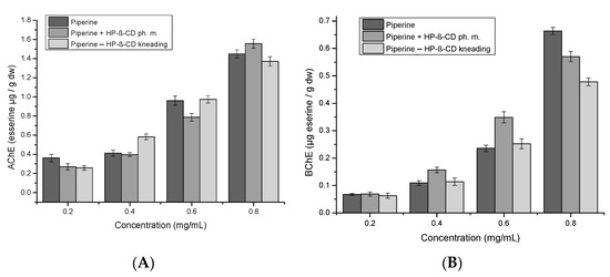 The inhibition of AChE and BuChE (Figure 9) increases with the concentration of the piperine. The highest inhibition of AChE is at the concentration of 0.8 mg/mL piperine in a physical mixture with HP-β-CD (1.56 ± 7.8 × 10−2 esserine μg/g dw), while BuChE for pure piperine (0.66 ± 1.3 × 10−2 esserine μg/g dw). For concentrations of 0.4 mg/mL and 0.6 mg/mL, the highest inhibition of AChE occurs for kneading mixture (0.58 ± 2.913 × 10−2 esserine μg/g dw) and (0.97 ± 4.9 × 10−2 esserine μg/g dw), respectively. The inhibition of BuChE 0.4 mg/mL and 0.6 mg/mL is the highest for physical (0.16 ± 9.9 × 10−3 esserine μg/g dw) and (0.35 ± 2.0 × 10−2 esserine μg/g dw), respectively. An elevation in the solubility of a substance having butyrylcholinesterase inhibition activity may result in an increase in the inhibition of this enzyme, as was already noted in the literature. According to Songngam S. et al.’s study, 5,7-dimethoxyflavone isolated from Kaempferia parviflora was combined with HP-β-CD by the freeze-drying method in a 1:1 molar ratio [25]. The solubility of 5,7-dimethoxyflavone after complexation was 361.8-fold enlarged, and the inhibitory activity of butyrylcholinesterase in vitro (in terms of the IC50 value) increased 2.7 times.
