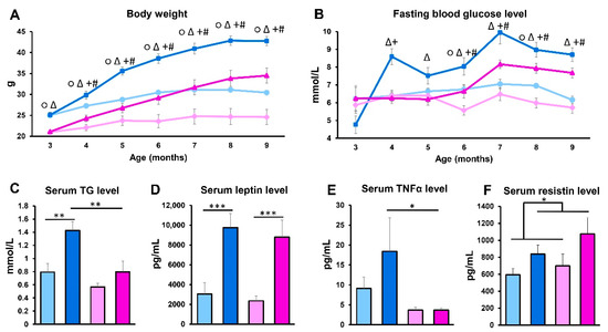 Body weight and serum parameters. (A) Body weight and (B) serum glucose levels were measured at baseline and monthly thereafter during the experiment (n = 10–12 animals/group). At the end of the experiment, serum samples were collected. (C) Serum TG levels were measured using an enzymatic colorimetric assay kit (n = 10–12 animals/group). (D) Serum concentrations of leptin, (E) TNFα, and (F) resistin were quantified using a MILLIPLEX® Mouse Adipokine Multiplex Immunoassay (n = 10 animals/group). Values are presented as mean ± SEM; ○ indicates wild-type male group vs. wild-type female group; Δ indicates APOB-100 male group vs. APOB-100 female group; + indicates APOB-100 male group vs. wild type male group; # indicates APOB-100 female group vs. wild type female group; * denotes p < 0.05; ** denotes p < 0.01; *** denotes p < 0.001. WT/ND, wild-type mice on normal diet; APOB/HFD, APOB-100 transgenic mice on high-fat diet; TG, triglyceride.