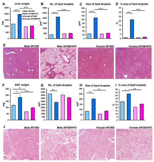 Lipid accumulation in the liver and brown adipose tissue. (A) Weight of the liver and (F) BAT were measured. Then, after formalin fixation, tissues were embedded in paraffin. (E) Liver and (J) BAT sections were stained with hematoxylin and eosin. Scale bar: 500 μm. The number (B—liver, G—BAT), size (C—liver, H—BAT), and area (D—liver, I—BAT) of lipid droplets were quantified using ImageJ software (n = 6 animals/group). Values are presented as mean ± SEM; * denotes p < 0.05; ** denotes p < 0.01; *** denotes p < 0.001. WT/ND, wild-type mice on normal diet; APOB/HFD, APOB-100 transgenic mice on high-fat diet; BAT, brown adipose tissue.