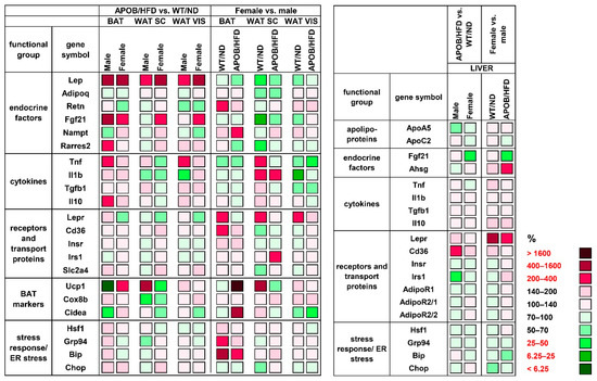 Heatmap of relative gene expression differences in adipose tissues and in the liver in response to hyperlipidemia. The relative expressions of different endocrine and cytokine factors, receptors, and transport proteins were studied in adipose tissues and in the liver of healthy and hyperlipidemic mice using qPCR (n = 6 animals/group). For APOB/HFD vs. WT/ND comparisons, the relative expression of target genes in transgenic animals was compared to the expression levels detected in wild-type animals (results are given as a percentage, where WT/ND groups = 100%). For the female vs. male comparison, the relative expression of target genes in females was compared to the expression levels detected in males (results are given in percentages, where the male groups = 100%). WT/ND, wild-type mice on normal diet; APOB/HFD, APOB-100 transgenic mice on high-fat diet; BAT, brown adipose tissue; WAT SC, subcutaneous white adipose tissue; WAT VIS, visceral white adipose tissue.