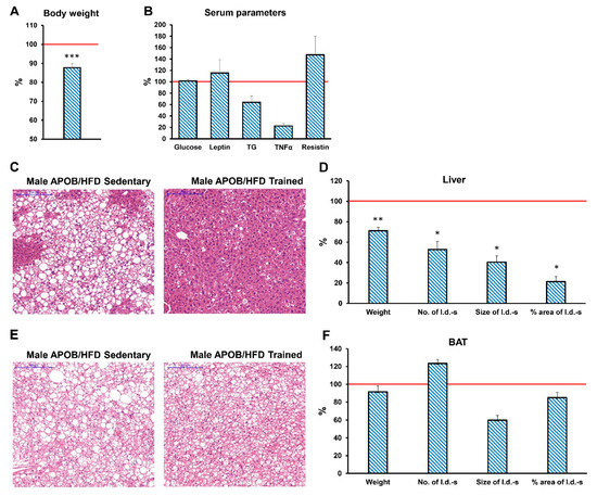 Effects of exercise training in HDF-fed male APOB-100 transgenic mice. At the end of the experiment, (A) body weight was measured and serum samples were collected to determine the concentration of (B) serum glucose, leptin, TG, TNFα, and resistin. Lipid accumulation in the liver and brown adipose tissue was also analysed. (C) Liver and (E) BAT sections were stained with hematoxylin and eosin. Scale bar: 200 μm. Weight of the (D) liver and (F) BAT were measured and the number, size, and area of lipid droplets in the (D) liver and in the (F) BAT were quantified using ImageJ software. Blue striped columns represent the differences in the given value in regularly trained APOB-100/HFD male mice, expressed as the percentage of the corresponding value for sedentary APOB-100/HFD males. n = 12 mice per group for body, liver, and BAT weight and serum glucose measurements, n = 10 mice per group for serum leptin, TNFα, and resistin concentration measurements, n = 6 mice per group for the quantification of lipid accumulation. Values are presented as mean ± SEM; * denotes p < 0.05; ** denotes p < 0.01; *** denotes p < 0.001. WT/ND, wild-type mice on normal diet; APOB/HFD, APOB-100 transgenic mice on high-fat diet; BAT, brown adipose tissue; l.d., lipid droplet.