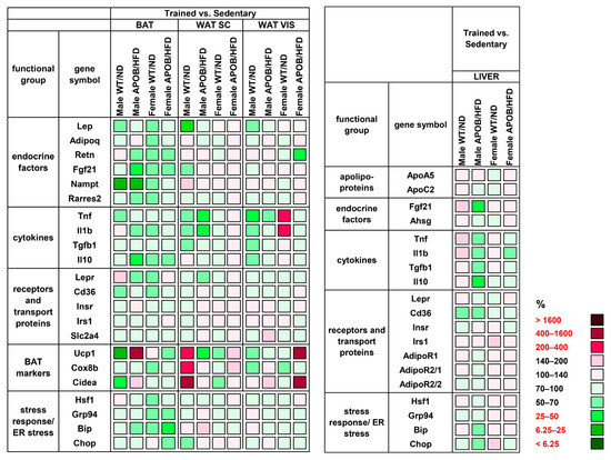 Heatmap of relative gene expression differences in adipose tissues and in the liver in response to exercise training. Relative expressions of different endocrine and cytokine factors, receptors, and transport proteins were studied in the adipose tissues and in the liver of healthy and hyperlipidemic mice using qPCR (n = 6 animals/group). The relative expression of target genes in sedentary animals was compared with the expression levels detected in the corresponding trained groups (results are given as a percentage, where the corresponding value for the sedentary groups = 100%). WT/ND: wild-type mice on normal diet; APOB/HFD, APOB-100 transgenic mice on high-fat diet; BAT, brown adipose tissue; WAT SC, subcutaneous white adipose tissue; WAT VIS, visceral white adipose tissue.