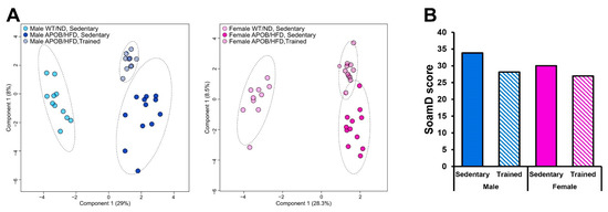 Lipidomic changes in response to exercise. (A) sPLS-DA score plots of lipidomic datasets; left panel—males, right panel—females. Dashed circles display 95% confidence regions. (B) SoamD scores (sum of absolute mol% difference for membrane lipids) for the APOB-100 transgenic groups compared to the corresponding sedentary WT groups.