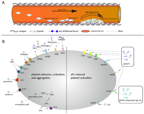 Thrombus formation under high shear and aPL related platelet activation. (A) Platelets bind to endothelial cells and collagen via VWF under high shear force, followed by platelets rolling over collagen and thrombus formation. (B) Under normal conditions, a variety of agonists and ligands bind their corresponding receptors, inducing platelet adhesion, activation and aggregation. aβ2GPI and aCL antibodies induce platelet activation in APS patients.