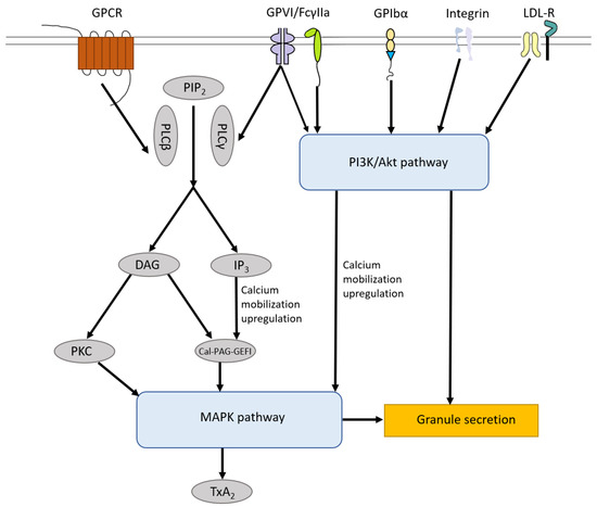 The signaling pathways induced by those receptors on the surface of platelets mentioned above share the MAPK pathway, which leads to TXA2 production and granule secretion, including α-granules and dense granules. In general, phosphatidylinositol 4,5-bisphosphate (PIP2) can be hydrolyzed by phospholipase Cβ (PLCβ, activated by GPCR) and phospholipase Cγ (PLCγ, activated by GPVI and FcγIIa), leading to the generation of diacylglycerol (DAG) and 1,4,5-inositol trisphosphate (IP3). Both DAG and IP3 trigger diacylglycerol regulated guanine nucleotide exchange factor I (Cal-DAG-GEFI) generation and only DAG can induce several isoforms of protein kinase C (PKC) activation, both of which activate the MAPK pathway [85,86]. GPVI, FcγIIa, GPIbα and integrin (αIIbβ3, α2β1) can induce the activation of the PI3K/Akt pathway which triggers the MAPK pathway, Ca2+ mobilization upregulation and granule secretion [87]. Low-density lipoprotein (LDL) receptors, including TLR2, TLR4, TLR8 and ApoER2′, also activate the PI3K/Akt pathway and downstream MAPK pathway [88,89] (Figure 2).