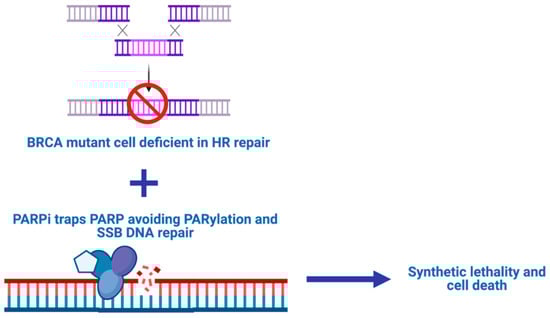 PARPi action is based on the concept of synthetic lethality []. Synthetic lethality is defined as a condition where the individual loss of two different genes is compatible with life, but when the loss occurs simultaneously for both genes, the cell is unable to survive. In 1997, Hartwell and colleagues first suggested the possibility of using synthetic lethality as a potential strategy for cancer treatment []. Since the development of cancer is driven by mutation, often caused by a deficiency in the ability to repair DNA damage [], it was logical, therefore, to suppose that the pharmacological inhibition of a second pathway involved in DNA repair would have represented a successful strategy.