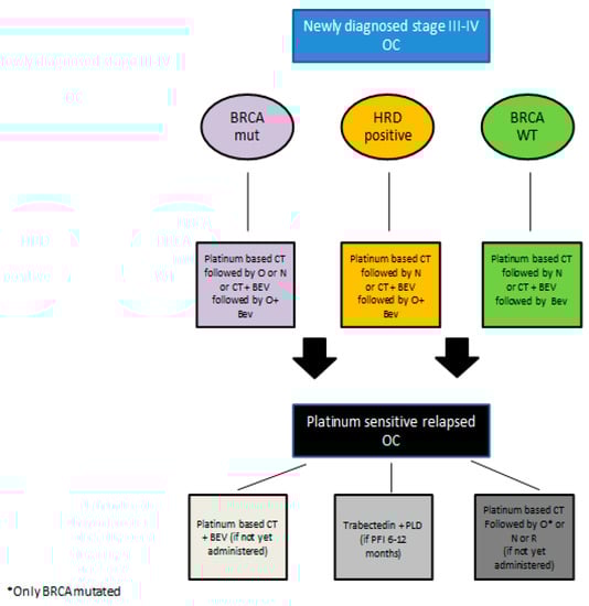 Proposed therapeutic algorithm for the treatment of advanced and relapsed epithelial ovarian cancer according to EMA indication. Legend: CT = chemotherapy; O = olaparib; N = niraparib; BEV = bevacizumab; PFI = platinum free interval; R = rucaparib.