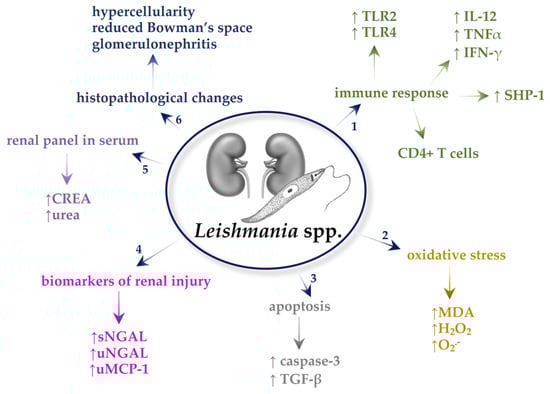 Mechanisms in Leishmania spp.-infected kidneys. 1. Leishmania spp. increase the expression of Toll-like receptors (TLRs), mainly TLR2 and TLR4, and they also affect the growth of interleukin-12 (IL-12), tumor necrosis factor-α (TNF-α), and interferon-γ (IFN-γ). It was found that Leishmania spp. increase SHP-1 activity in the kidneys of hosts. The inflammatory cells, which are observed in the kidneys of hosts infected with Leishmania spp., are CD4+ T cells. 2. Leishmania spp. cause oxidative stress manifested by an increase in malondialdehyde (MDA), H2O2, and O2–. 3. Leishmania spp. cause an increase in caspase-3 activity, the main enzyme in the process of apoptosis, and an increase in transforming growth factor β (TGF-β) level, an apoptotic inducer. 4. Biomarkers, which increase in nephropathy caused by Leishmania spp., are serum and urine neutrophil gelatinase-associated lipocalin (sNGAL and uNGAL, respectively) and monocyte chemoattractant protein-1 in the urine (uMCP-1). 5. Leishmania spp. cause an increase in creatine (CREA) and urea levels in the serum of hosts. 6. The parasites cause hypercellularity, reduced Bowman’s space, and glomerulonephritis in the kidneys.