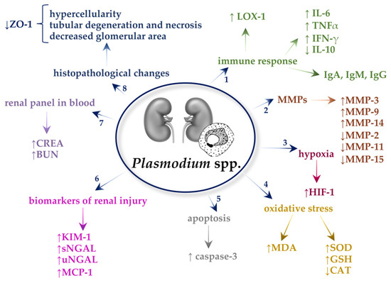 Mechanisms in Plasmodium spp.-infected kidneys. 1. Plasmodium spp. increase the expression of lectin-like oxidized low-density lipoprotein receptor 1 (LOX-1), and they also affect the growth of interleukin-6 (IL-6), tumor necrosis factor-α (TNF-α), and interferon- γ (IFN-γ). It was found that Plasmodium spp. decrease the level of the anti-inflammatory cytokine IL-10. The deposition of immunoglobulin (Ig)A, IgM, and IgG was reported in the glomeruli of mice infected with Plasmodium spp. 2. Malaria causes an increase in matrix metalloproteinase (MMP)-3, MMP-9, and MMP-14 and a decrease in MMP-2, MMP-11, and MMP-15. 3. The Plasmodium spp. infection causes hypoxia in the kidneys by increasing the hypoxia-inducible factor 1 (HIP-1). 4. Plasmodium spp. cause oxidative stress manifested by an increase in malondialdehyde (MDA) and an increase in superoxide dismutase (SOD), as well as reduced glutathione (GSH) and a decrease in catalase (CAT). 5. Plasmodium spp. cause an increase in caspase-3 activity, the main enzyme in the process of apoptosis. 6. Biomarkers, which increase in nephropathy caused by Plasmodium spp., are serum and urine neutrophil gelatinase-associated lipocalin (sNGAL and uNGAL, respectively) and monocyte chemoattractant protein-1 (MCP-1) and kidney injury molecule 1 (KIM-1) in kidneys. 7. Plasmodium spp. cause an increase in creatine (CREA) and blood urea nitrogen (BUN) levels in the blood of hosts. 6. The parasites cause hypercellularity, tubular degeneration, and necrosis and also decreased glomerular area, which may be caused by decreased tight junction-associated protein, zonula occludens-1 (ZO-1) in the kidneys.