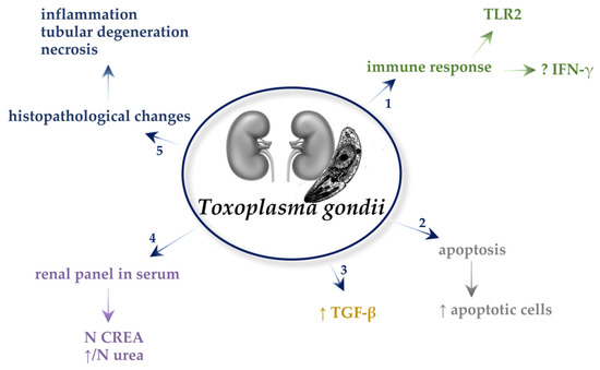 Mechanisms in Toxoplasma gondii-infected kidneys. 1. TLR2 has a protective role in kidney function against T. gondii infection. While studies about IFN-γ varied, it is reported that IFN-γ inhibits the replication of T. gondii in the kidneys and that it does not play a role in the protection of the renal function against T. gondii infection. 2. The percentage of apoptotic cells was higher in the kidneys with T. gondii infection. 3. Toxoplasma gondii cause increased expression of transforming growth factor β (TGF-β). 4. Toxoplasma gondii cause no difference in serum creatine (CREA). The urea level may be elevated or in normal ranges. 5. The parasites cause inflammation, tubular degeneration, and necrosis in the kidneys.