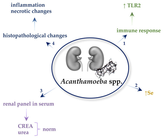 - Łanocha-Arendarczyk, N.; Baranowska-Bosiacka, I.; Kot, K.; Pilarczyk, B.; Tomza-Marciniak, A.; Kabat-Koperska, J.; Kosik-Bogacka, D. Biochemical Profile, Liver and Kidney Selenium (Se) Status during Acanthamoebiasis in a Mouse Model. Folia Biol. 2018, 66, 33–40. [Google Scholar] [CrossRef]