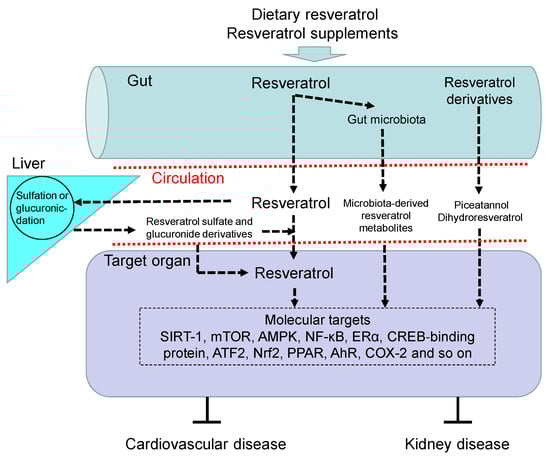 - Song, J.Y.; Shen, T.C.; Hou, Y.C.; Chang, J.F.; Lu, C.L.; Liu, W.C.; Chen, P.J.; Chen, B.H.; Zheng, C.M.; Lu, K.C. Influence of Resveratrol on the Cardiovascular Health Effects of Chronic Kidney Disease. Int. J. Mol. Sci. 2020, 21, 6294. [Google Scholar] [CrossRef] [PubMed]