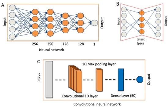 Neural networks used for the analysis of MET variants. (A) NN for the detection of exon 14 skipping events. (B) Sparsely-connected autoencoders for the detection of MET transcription variants. (C) Convolutional neural network (CNN).
