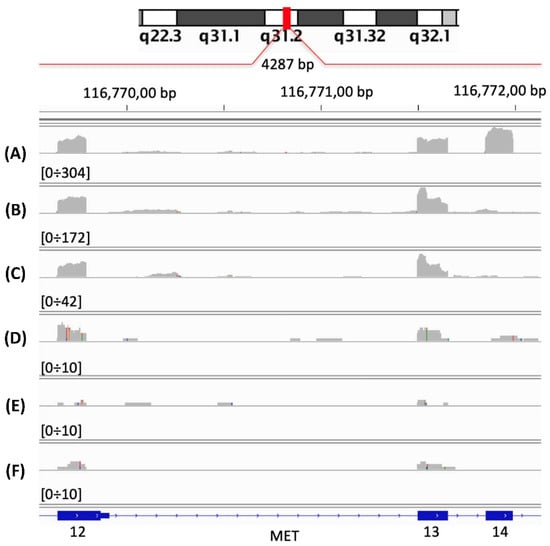 We could detect only one METΔ14 in 280 bladder samples. Then, we detected few false METΔ14 in cervix, corpus uteri, heart/mediastinum/pleura, kidney and skin samples, Table 2. The six transcripts detected in cervix, Table 2, were erroneously detected as METΔ14, because they have a blurry coverage on exons 13 ÷ 15, Figure 4C. However, when the full MET locus is observed, it is clear that these METΔ14 false positives are a completely different type of transcript. A shared characteristic of these transcripts is the high accumulation of reads in the second intron (approx. chr7:116,715,690–116,717,329), Figure 4A, in the 6th exon, Figure 4B, and in the last non-coding MET exon, Figure 4D.