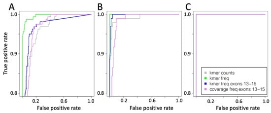 The results are organized (Figure 5) on the basis of the type of input data, i.e., whole MET exons kmer counts (Figure 5A), MET exons 13 ÷ 15 kmer count frequency (Figure 5B) and MET exons 13–15 coverage frequency (Figure 5C). The best ratio between true positive and false positive is shown for all kernels using test samples characterized by 5000 reads coverage. As also seen for NN (Figure 3), the specificity progressively decreases when the coverage is reduced.