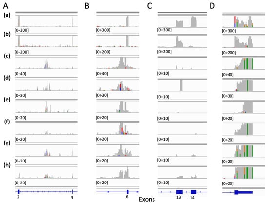 METΔ14 false positive detected in cervix. (a) WT MET from A549 RNAseq sample (33 million reads), 27,152 reads mapping on MET locus, (b) METΔ14 from NCI-H596 RNAseq sample (27 million reads), 24,850 reads mapping on MET locus, (c–h) False METΔ14. (A) Zoom in the 2–3 exons region. (B) Zoom in 6th exon region. (C) Zoom in 13–15t exons region. (D) zoom in last exon region.