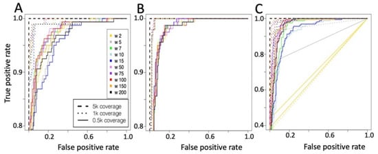 The detection efficiency of METΔ14 using 16 k-mers frequency counts showed best performances at 500 and 1000 reads coverage, Figure 3A,B, as instead at 5000 reads coverage of all the different test sets performed in the same way, Figure 3C.