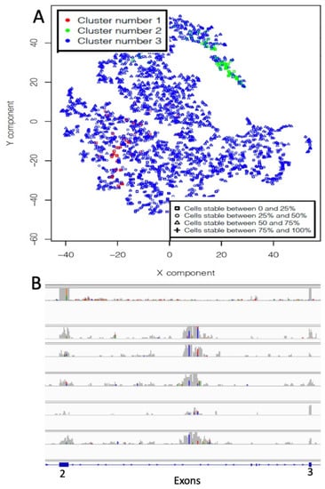 Our group have recently published a paper on the use of SCA for the identification of hidden functional regulatory elements in single cell RNAseq data []. We tested this type of autoencoder to see if we could grasp non-canonical isoforms from the analysis of the TCGA samples used in the previous paragraph. The SCA was designed to take as input k-mer count frequency or coverage frequency of MET exons. The SCA hidden layer, i.e., latent space, is representing MET exons. Input nodes are only connected to the exon nodes they are associated (Figure 1B). We trained the SCA with the 2605 TCGA samples and clustered the latent space data using gridFLOW []. To estimate the stability of clusters generated using the SCA latent space, we compared thousands of pairs of clusters generated by SCA latent space clustering, as previously described by us []. The rationale of this approach is that, if a cluster’s organization is conserved, it should be depicted by the multiple comparisons of randomly paired latent space cluster representations []. The best results were obtained using normalized [] MET coverage frequency data (Figure 5A). Unfortunately, the stability of the clusters was very poor (Figure 6A). However, an inspection of a random subsets of samples associated with cluster 2 (Figure 6B) suggests that at least cluster 2 seems to be made mainly of transcripts recalling the organization of MET-LINE1 fusion, which we have described in previous paragraphs.